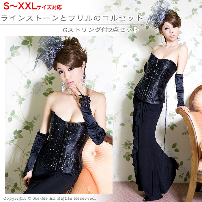 【コルセット 編み上げ ビスチェ】Gストリング付き☆ラインストーンとフリルのコルセット[sl5038−2](ブラック)5400円(税込)以上で【送料無料】ダイエットや腰痛に補正下着でくびれGet♪♪