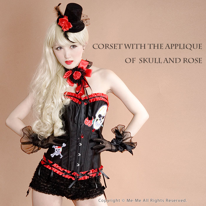 ◇【コルセット 編み上げ ビスチェ】Gストリング付き♪ローズ&スカルアップリケのコルセット [sl5255] (ブラック)/ミーミー☆コスプレ☆ゴスロリ◎5400円(税込)以上で【送料無料】も!くびれGet♪腰痛にも♪